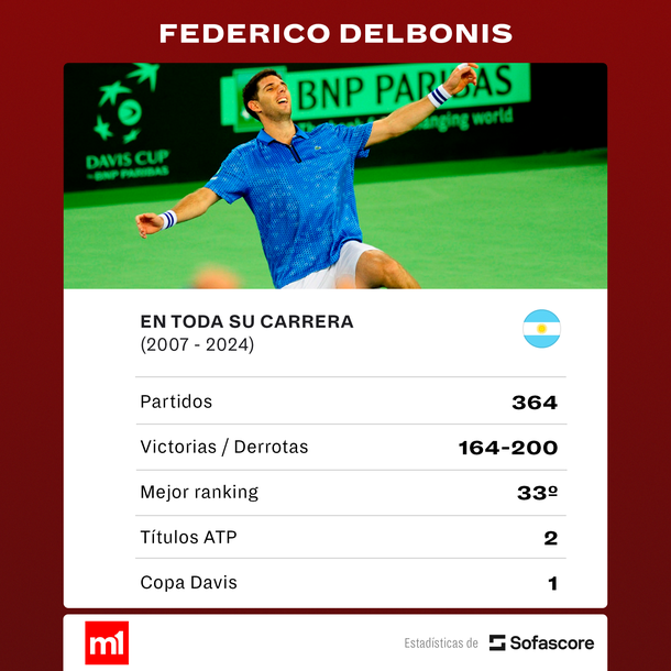Además de aquel recordado trofeo para la Albiceleste, Delbonis ganó dos títulos ATP (Sao Paulo 2014 y Marrakech 2016 -ambos 250s sobre polvo de ladrillo-) y supo vencer tanto a Roger Federer como a Andy Murray, entre otros Top 5.