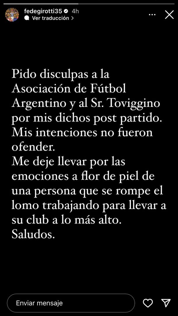 En torno a este mal trago y con el fin de calmar las aguas, el delantero de la "T" mostró arrepentimiento en sus redes sociales: "Pido disculpas a la Asociación de Fútbol Argentino y al Sr. Toviggino por mis dichos post partido. Mis intenciones no fueron ofender", comenzó el futbolista.