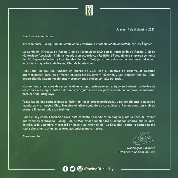 El exfutbolista de River y gerenciador de Racing Club de Montevideo SAD, Fernando Cavenaghi, acordó con el grupo accionista Red&Gold, compuesto por Bayern Múnich de Alemania y Los Ángeles Football Club de Estados Unidos, para que se convierta en accionista mayoritario de la institución uruguaya.