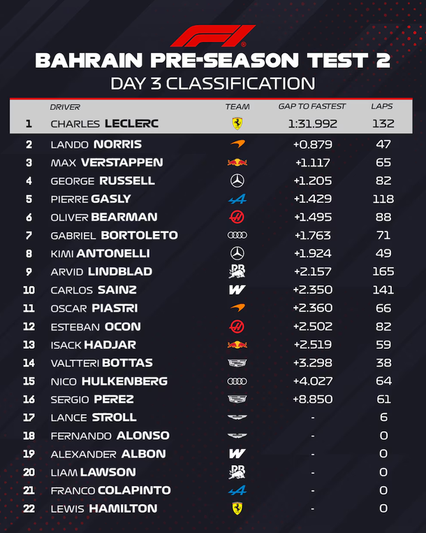 La contracara de la jornada la protagonizó Aston Martin F1 Team. Lance Stroll apenas pudo completar seis vueltas antes de que el equipo decidiera poner punto final anticipado a su actividad. Los inconvenientes de fiabilidad, especialmente vinculados a las unidades de potencia Honda, limitaron considerablemente su programa y lo dejaron como el conjunto con menos giros acumulados en todo el test.