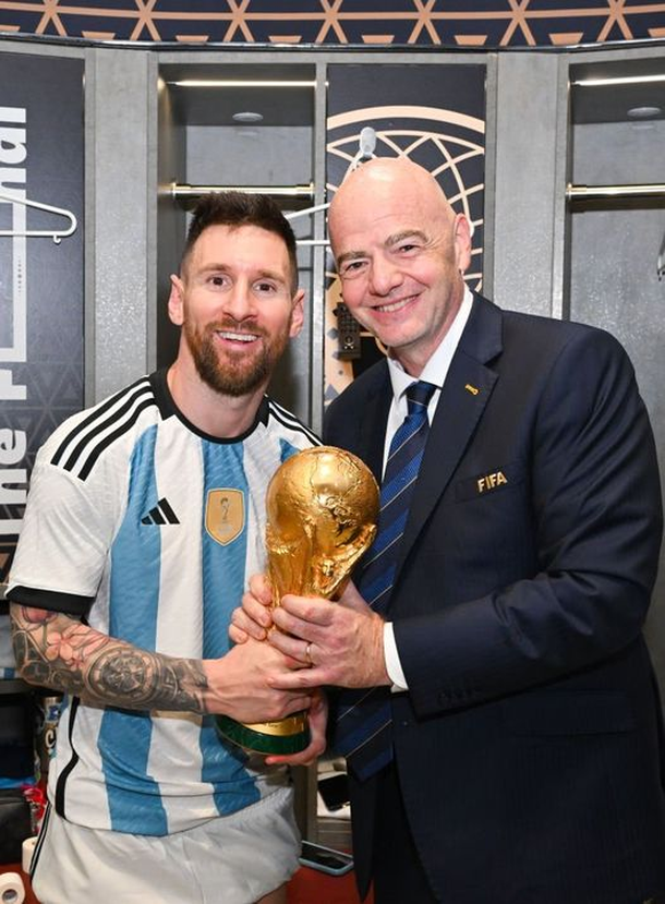 "No podrías escribir un guion así aunque lo intentaras. El mundo entero se detuvo, y fue correcto parar. Qué recuerdo tan notable para reflexionar con orgullo y alegría", expresó Infantino. Entre los recuerdos de aquel día, Infantino atesora una foto con Lionel Messi y la Copa del Mundo en el vestuario del Lusail.