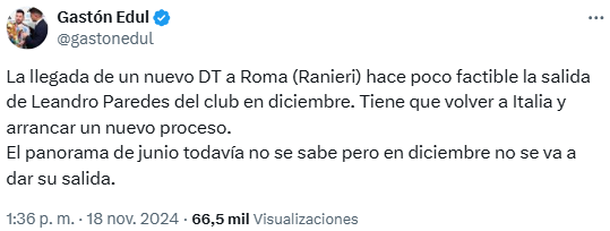 En este sentido, Gastón Edul aportó mayores detalles: "La llegada de un nuevo DT a Roma (Ranieri) hace poco factible la salida de Leandro Paredes del club en diciembre. Tiene que volver a Italia y arrancar un nuevo proceso", anticipó el periodista deportivo.