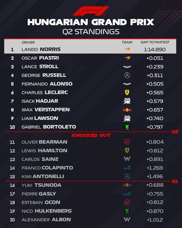 En la pelea de arriba, Lando Norris (McLaren) se llevó una gran victoria tras resistir el asedio de su compañero Oscar Piastri, que cruzó segundo. El británico George Russell (Mercedes) completó el podio tras superar a Charles Leclerc, que había conseguido la pole position pero fue perjudicado por una mala estrategia de Ferrari, que lo relegó al cuarto lugar.