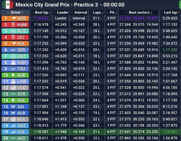 Franco Colapinto terminó anteúltimo la Práctica Libre 3 del GP de México