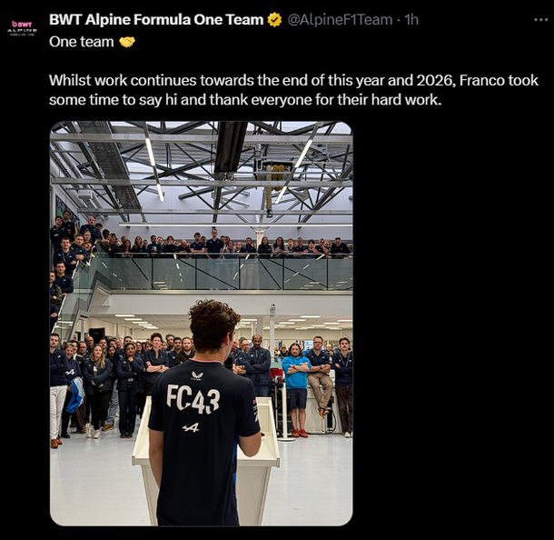 "Aunque el trabajo continúa de cara a finales de este año y durante 2026, Franco se tomó un tiempo para saludar y agradecer a todos su arduo trabajo", culmina el mensaje. La escudería atraviesa un proceso de transformación profunda, con ajustes estructurales y técnicos para adaptarse al nuevo reglamento que entrará en vigor en 2026.