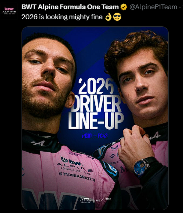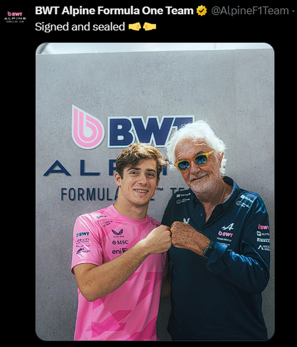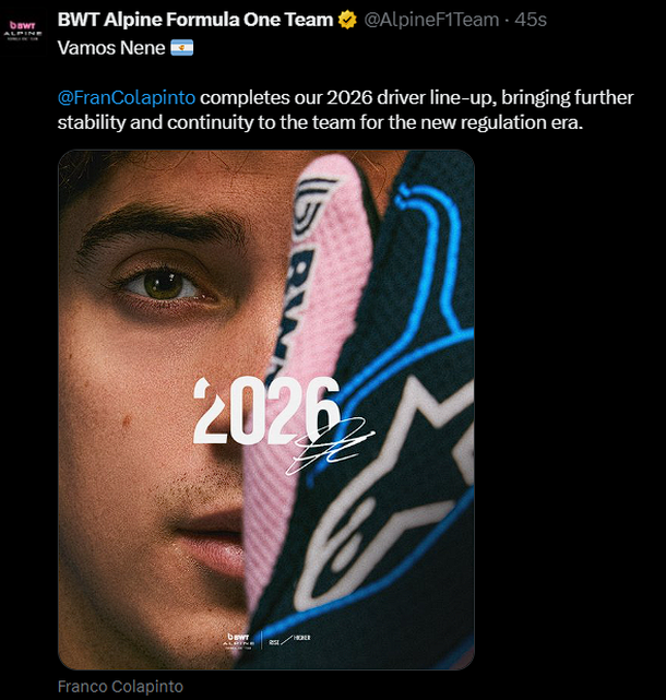 "Vamos Nene. @FranColapinto completa nuestra alineación de pilotos para 2026, brindando mayor estabilidad y continuidad al equipo para la nueva era de regulación", dice el mensaje oficial que publicó el conjunto que comanda Flavio Briatore. Luego, publicaron una foto con el italiano chocando los puños con el argentino.