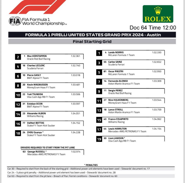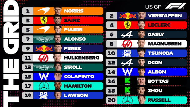 Así será la largada del Gran Premio de Estados Unidos: Franco Colapinto saldrá desde el puesto °15