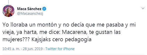 Apelando un poco al humor sobre aquel momento, mencionó qué le sucedía a ella y cómo reaccionó su mamá: “Yo lloraba un montón y no decía qué me pasaba y mi vieja, ya harta, me dice: 'Macarena, ¿te gustan las mujeres?' Jajajaja cero pedagogía”.