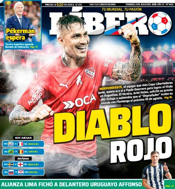 "Diablo Rojo", así títula el diario Líbero de Perú sobre la posible llegada de Paolo Guerrero a Independiente para la próxima temporada.