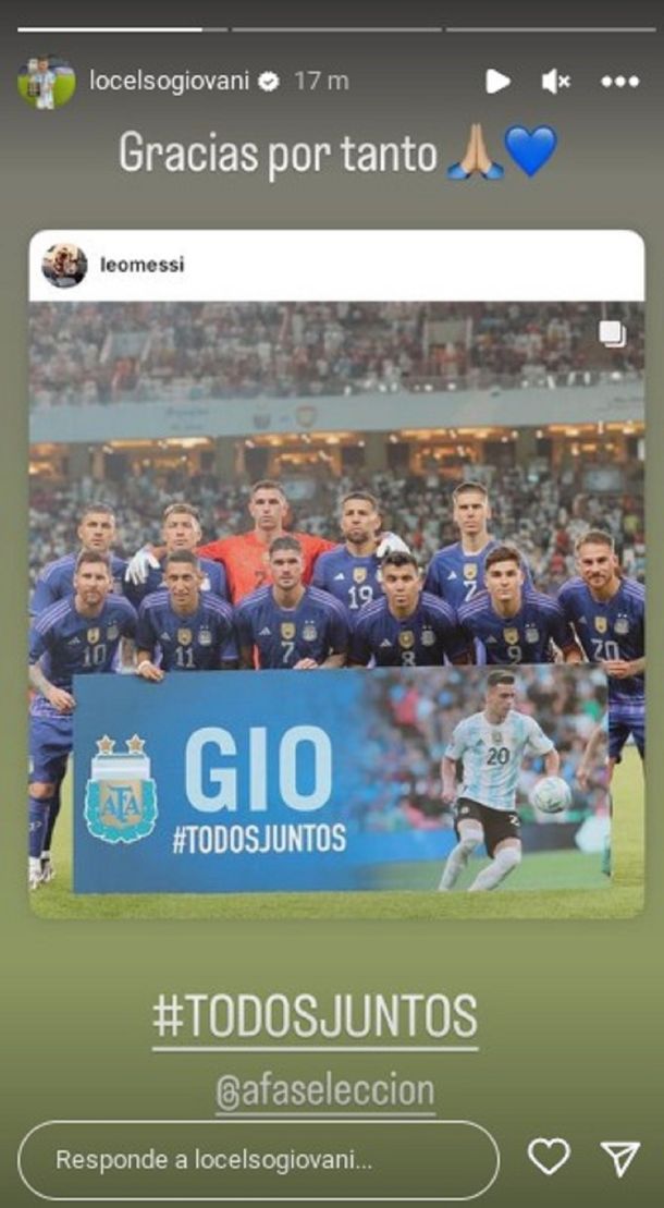Gio compartió en sus historias de Instagram el posteo de Lionel Messi, donde se ve el cartel con el que salieron a la cancha en Abu Dhabi, y comentó: "Gracias por tanto", junto a un corazón y el emoticón de unas manos en muestra de agradecimiento, y agregó el hashtag #TodosJuntos.