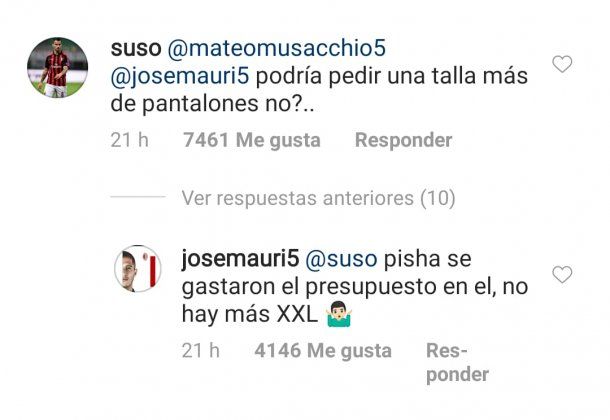 "Podría pedir una talla más de pantalones, no?", escribió el jugador español, a lo que el volante argentino se sumó: "Se gastaron el presupuesto en él, no hay más XXL".