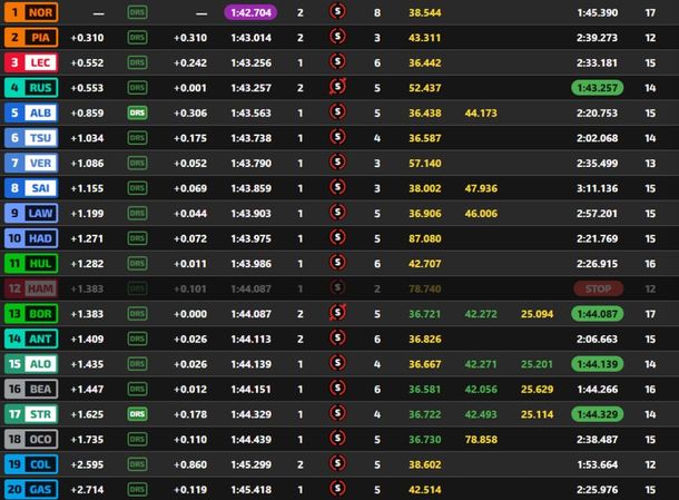 Pese a poder continuar, el argentino perdió rendimiento y ya no logró regresar al pelotón. Finalmente, cruzó la bandera a cuadros en el 19° puesto, justo detrás de Gasly (18°). Oscar Piastri, en tanto, abandonó en la primera vuelta tras un fuerte impacto contra el muro.
