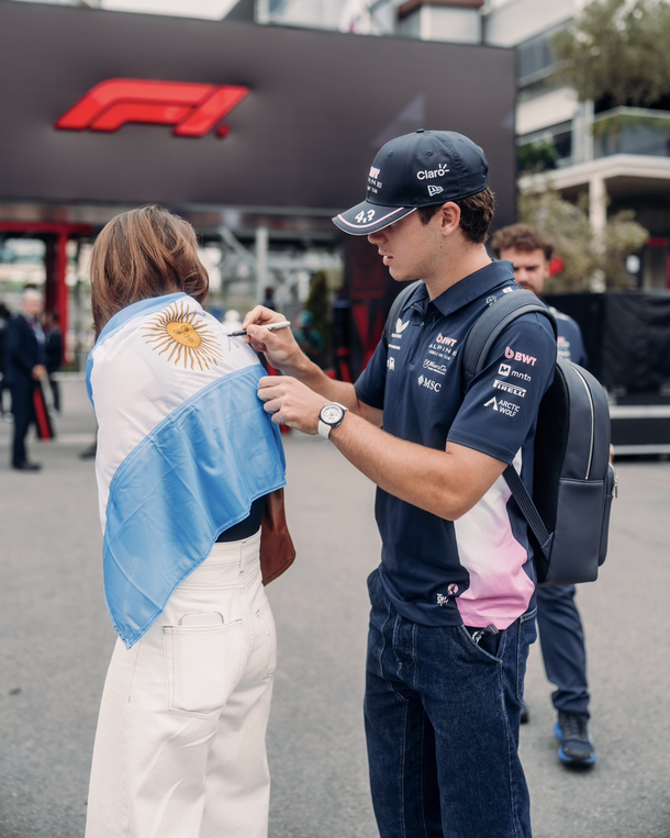 Franco Colapinto le firma la bandera a una fan argentina en el paddock
