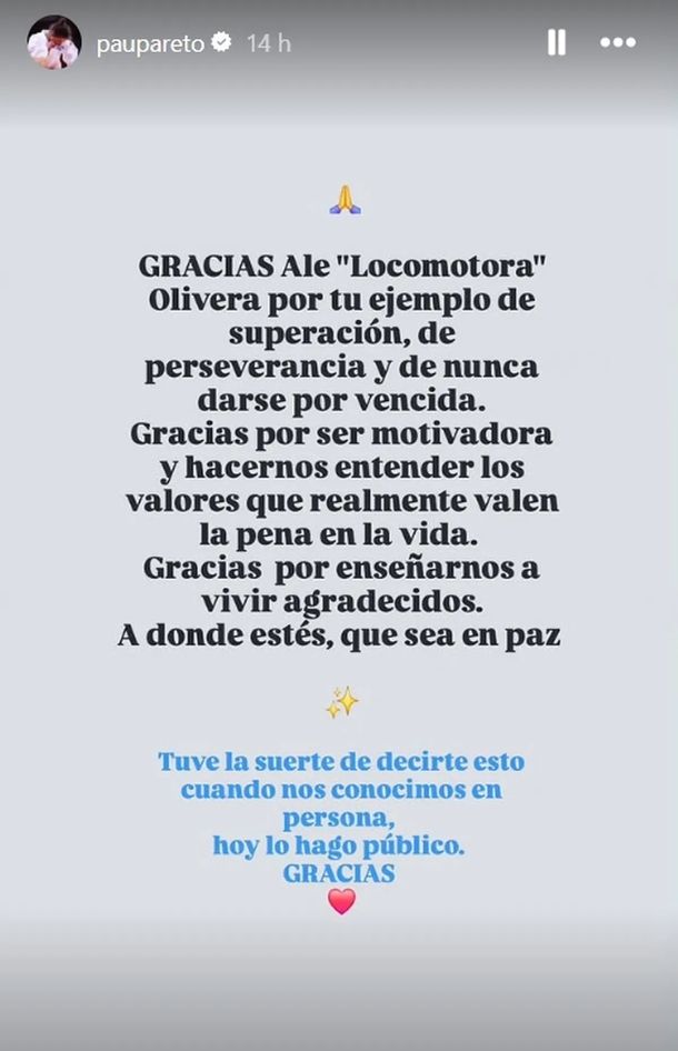 "Gracias Ale Locomotora Oliveras por tu ejemplo de superación, de perseverancia y de nunca darse por vencida. Gracias por ser motivadora y hacernos entender los valores que realmente valen la pena en la vida. Gracias por enseñarnos a vivir agradecidos. Adonde estés, que sea en paz", escribió la Peque en una historia de Instagram.
