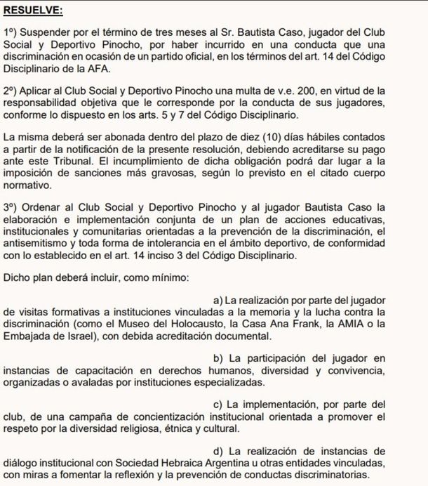 Según el descargo presentado por el club Pinocho, la frase fue producto de un “exabrupto” en un contexto de tensión, sin intención discriminatoria ni motivaciones antisemitas. Sin embargo, el Tribunal consideró que el insulto constituye una conducta violenta y discriminatoria, incompatible con los valores del deporte y la convivencia dentro del ámbito futbolístico.
