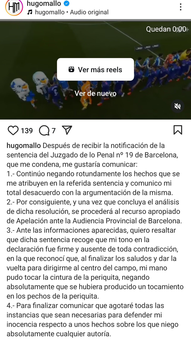 Asimismo, aseguró que "se procederá al recurso apropiado de Apelación ante la Audiencia Provincial de Barcelona" y que agotará "todas las instancias para defender mi inocencia".