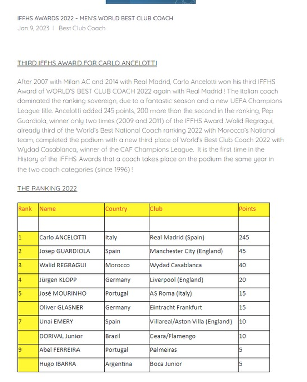 En el caso de los clubes, el mejor fue Carlo Ancelotti, seguido por Pep Guardiola, mientras que en el décimo lugar aparece un argentino: nada menos que en el entrenador de Boca, Hugo Ibarra.