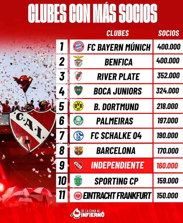 El club comunicó la noticia a través de su área de prensa: "En las últimas horas, se dio de alta en el registro de socios al Sr. Jorge Rodrigo Ibáñez con el número de socio 160.000", revelaron en un comunicado. Cabe recordar que, según un ranking publicado meses atrás por la página especializada Transfermarkt, Independiente ya se encontraba dentro del selecto grupo de los diez clubes con más socios a nivel mundial.