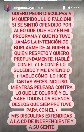 Ante el repudio y las reacciones en las redes sociales, Díaz emitió un breve comunicado que publicó en sus historias de Instagram: “Quiero pedir disculpas a mi querido Julio Falcioni si se sintió ofendido por algo que dije hoy en mi programa y que no tuvo jamás la intención de burlarme de alguien a quien respeto y quiero profundamente”, escribió.