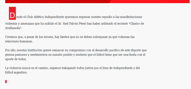 Independiente publicó este martes un comunicado en el que repudió las amenazas que recibió el árbitro Yael Falcón Pérez luego de su actuación en el clásico de Avellaneda contra Racing.