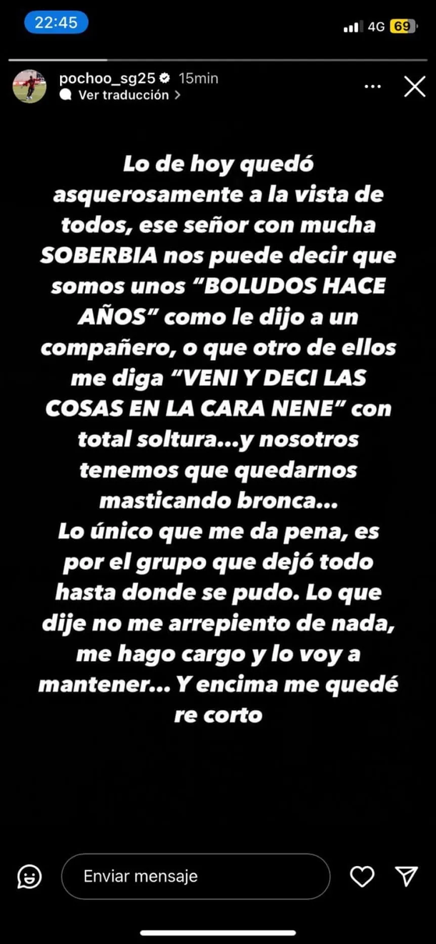 Diego Segovia: "Lo de hoy quedó asquerosamente a la vista de todos. Ese señor con mucha soberbia nos puede decir que somos unos 'boludos hace años', como le dijo a un compañero. O que otro de ellos me diga 'vení y decí las cosas en la cara, nene', con total soltura. Nosotros tenemos que quedarnos masticando bronca... Lo único que me da pena es por el grupo que dejó todo hasta donde se pudo. Lo que dije no me arrepiento de nada. Me hago cargo y lo voy a mantener. Encima me quedé re corto".