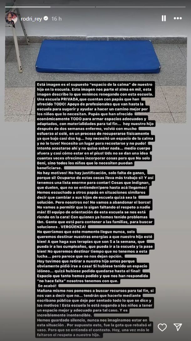 Junto a una foto de una colchoneta en el piso, Rey aseveró: “Esta imagen es el supuesto ‘espacio de calma’ de nuestro hijo en la escuela. Esta imagen describe lo que venimos renegando con esta escuela. Esta imagen nos parte el alma en mil. Una escuela privada, que cuentan con papás que han ofrecido todo”.