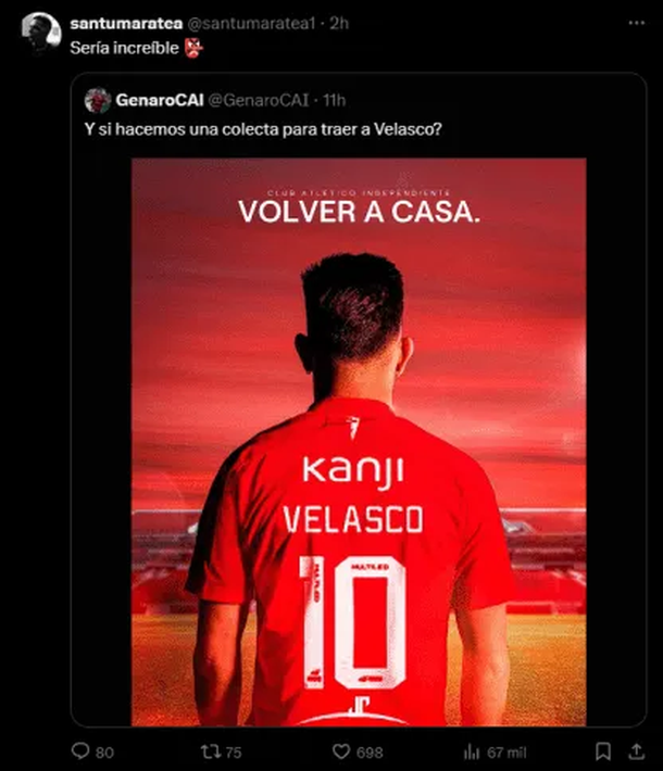 Todo comenzó cuando un usuario en la red social X, @GenaroCAI, lanzó la idea de organizar una colecta para traer de vuelta a Velasco, quien se formó en las inferiores del Rojo y está en negociaciones abiertas con Boca para sumarse al plantel en este mercado de pases.