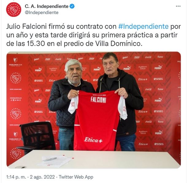 "Julio César Falcioni inicia su tercer ciclo al frente del Primer Equipo de Independiente. ¡Bienvenido, Julio! Que sea con todos los éxitos", informó el club de Avellaneda a través de sus cuentas oficiales en redes sociales.