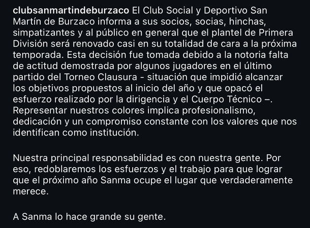 "El Club Social y Deportivo San Martín de Burzaco informa a sus socios, socias, hinchas, simpatizantes y al público en general que el plantel de Primera División será renovado casi en su totalidad de cara a la próxima temporada. Esta decisión fue tomada debido a la notoria falta de actitud demostrada por algunos jugadores en el último partido del Torneo Clausura - situación que impidió alcanzar los objetivos propuestos al inicio del año y que opacó el esfuerzo realizado por la dirigencia y el Cuerpo Técnico –. Representar nuestros colores implica profesionalismo, dedicación y un compromiso constante con los valores que nos identifican como institución.