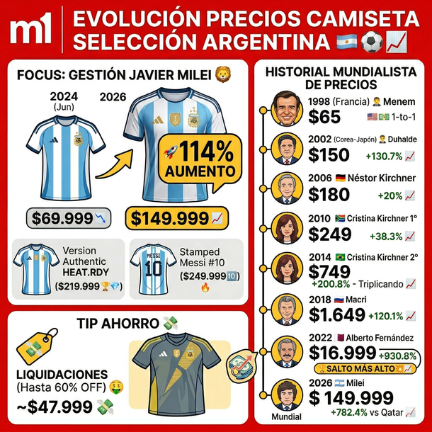 Un repaso histórico del valor de la casaca oficial de la Selección Argentina desde 1998 a 2026. La inflación mundialista de cada gobierno.