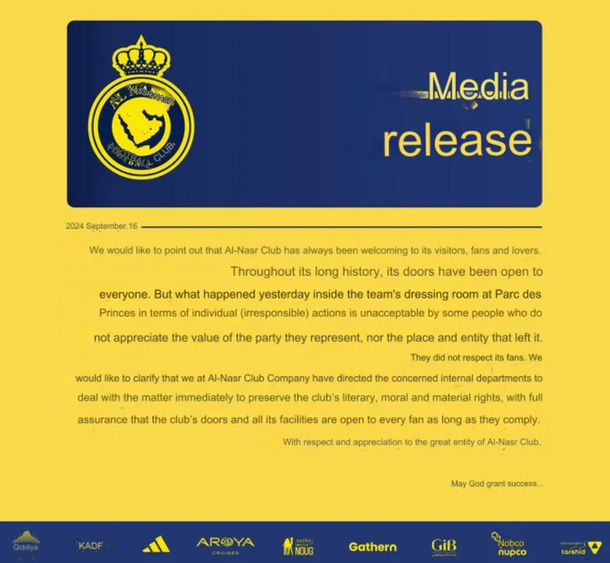 El club saudí llamó la atención en redes sociales al emitir un comunicado en el que expresaba su descontento por los "actos irresponsables" del influencer, calificando lo ocurrido como "inaceptable" y exigiendo respeto por la institución y sus jugadores. A pesar de la controversia, el club aclaró que sus instalaciones están abiertas a todos aquellos que muestren respeto por la entidad.