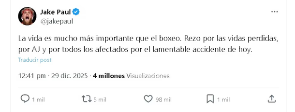 Tras conocerse la magnitud del hecho, Jake Paul utilizó sus redes sociales para expresar su pesar. “La vida es mucho más importante que el boxeo. Estoy rezando por las vidas perdidas, por AJ y por todos los afectados por este desafortunado accidente”, escribió el estadounidense en su cuenta oficial de X. El mensaje llamó la atención no solo por su tono, sino también por el contexto reciente entre ambos protagonistas.