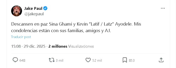 Días después del combate que los enfrentó en Miami, Paul amplió su mensaje al confirmarse la identidad de las víctimas fatales. “Descansen en paz Sina Ghami y Kevin ‘Latif / Latz’ Ayodele. Mis condolencias están con sus familias, amigos y AJ”, publicó, dejando en claro que la tragedia había superado cualquier rivalidad deportiva. Según medios locales, ambos fallecidos habían acompañado a Joshua durante su última pelea y formaban parte de su círculo de mayor confianza.
