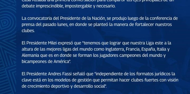 El comunicado también menciona la importancia de una "reconstrucción" del fútbol argentino, planteando una estrategia para fortalecerlo en todos los niveles, lo que incluye la posibilidad de abrir el deporte a nuevas inversiones y modelos de gestión.