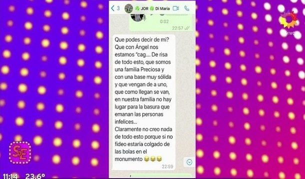“Ella asegura que los chats son reales pero en tono de broma, para ubicar a algunas personas”, reveló Varela y añadió: “Con Ángel nos estamos riendo de todo esto. Somos una familia preciosa y sólida. Si esto fuera cierto, Fideo estaría ‘colgado de las bolas del monumento’”.