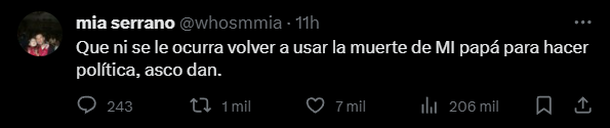 “Que ni se le ocurra volver a usar la muerte de mi papá para hacer política. Asco dan”, contestó Mia en una publicación. Ante la respuesta de un simpatizante del club de La Ribera, se defendió: “Si pensás que tengo algún problema personal con Román, estás equivocada. No me importa ni él ni su gente, pero prometí defender la memoria de mi papá sin importar lo que me cueste”.