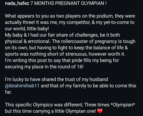 En su publicación, Hafez destacó que competir durante el embarazo fue una experiencia llena de desafíos, tanto a nivel físico como emocional. Describió cómo, a pesar de las dificultades, se sintió apoyada por su familia y su equipo, lo que le permitió superar las barreras que enfrentó. La esgrimista también agradeció el respaldo de su pareja y su familia, quienes le brindaron el apoyo necesario para llevar a cabo su participación