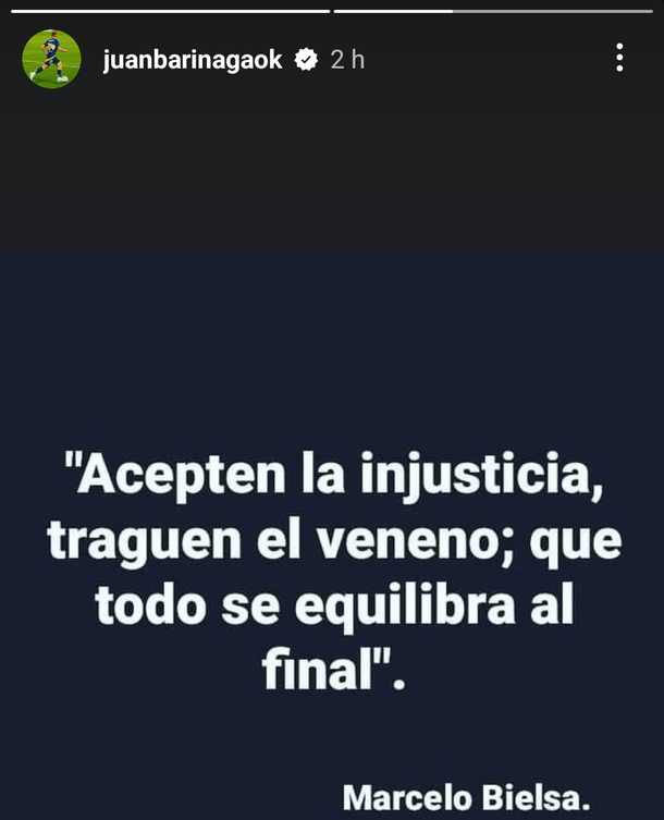 El lateral derecho, que llegó desde Belgrano, compartió una frase de Marcelo Bielsa que dejó entrever su disconformidad: “Acepten la injusticia, traguen el veneno; que todo se equilibra al final”. El mensaje fue publicado en su cuenta oficial apenas un día después de conocerse la lista para el duelo ante Tigre, en la que Mariano Herrón optó por mantener a Luis Advíncula y Lucas Blondel como las principales variantes en ese sector.