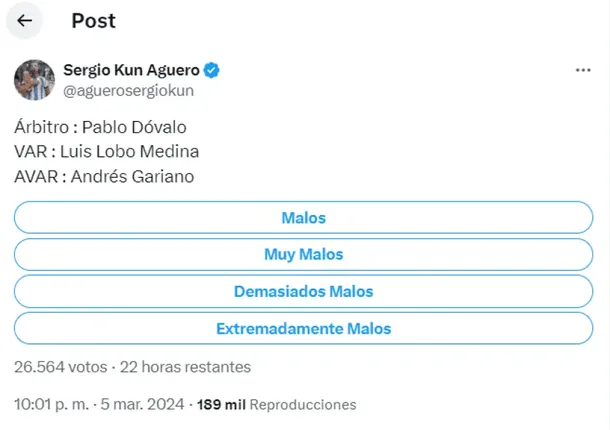 El ex delantero compartió una encuesta en la red social para que sus seguidores puedan calificar el accionar del juez principal y sus asistentes. Las opciones iban de “malos” hasta “extremadamente malos”.