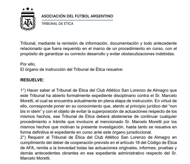 Además de frenar el juicio interno, la AFA exigió al club de Boedo que le remita “todas las actuaciones originales, informes, pruebas y demás antecedentes” relacionados con la denuncia que motivó el apartamiento de Moretti. Lo hace amparándose en el artículo 18 del Código de Ética, que establece la obligación de cooperación entre instituciones.