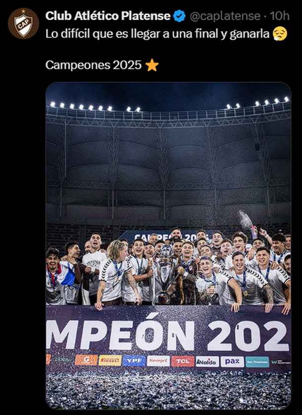 A través de su cuenta oficial en X, el club de Vicente López escribió un mensaje que mezcló ironía y orgullo: “Lo difícil que es llegar a una final y ganarla Campeones 2025”. La publicación, en referencia a la consagración del Calamar en el Torneo Apertura 2025, rápidamente se viralizó y encendió la mecha de la eterna rivalidad con el conjunto de La Paternal. Miles de usuarios compartieron el tuit, generando un sinfín de reacciones entre burlas, reproches y recuerdos de enfrentamientos pasados.