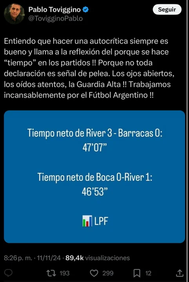 El numero 2 de Claudio "Chiqui" Tapia defendió así la labor arbitral y detallando que en el reciente partido entre River y Barracas Central se jugaron 47 minutos y 7 segundos de tiempo neto, apenas 14 segundos más que en el último Superclásico ante Boca en La Bombonera, que el Millonario ganó 1-0.