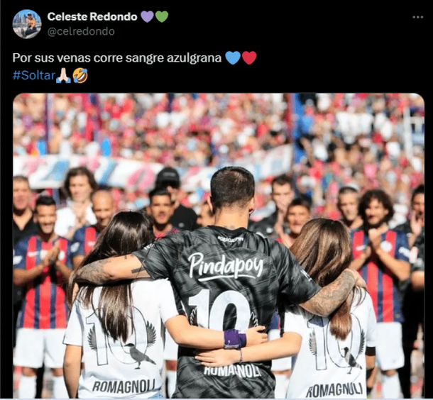 También a través de X, la mujer del futbolista compartió una imagen de la despedida de Romagnoli en el Nuevo Gasómetro y escribió: “Por sus venas corre sangre azulgrana”, acompañado del hashtag #soltar y un emoji de risa, minimizando la burla del Globo.