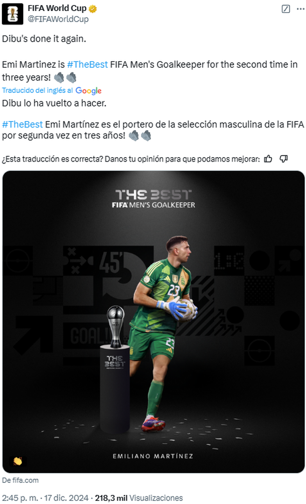 Esta es la segunda vez que Dibu Martínez recibe este premio individual, ya que en 2022 también se consagró como el mejor arquero del mundo, después de su actuación estelar en el Mundial de Qatar, donde fue clave para que Argentina levante su tercera Copa del Mundo.