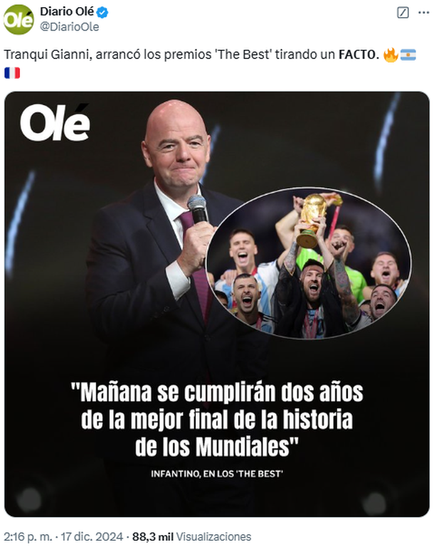 Por supuesto, Gianni Infantino -titular de la máxima autoridad en el fútbol- encabezó la ceremonia que emociona a todos los futboleros, aunque lo que se destacó de su participación en el evento fue una llamativa frase que conquistó a los argentinos: "Mañana se cumplirán dos años de la mejor final de la historia de los mundiales", señaló, en referencia al duelo definitivo entre la Selección Argentina y Francia, donde los dirigidos por Lionel Scaloni levantaron la Copa del Mundo en Qatar 2022. Como era de esperarse, este comentario del presidente de la FIFA no pasó inadvertido y rápidamente tomó notoriedad en las redes sociales.