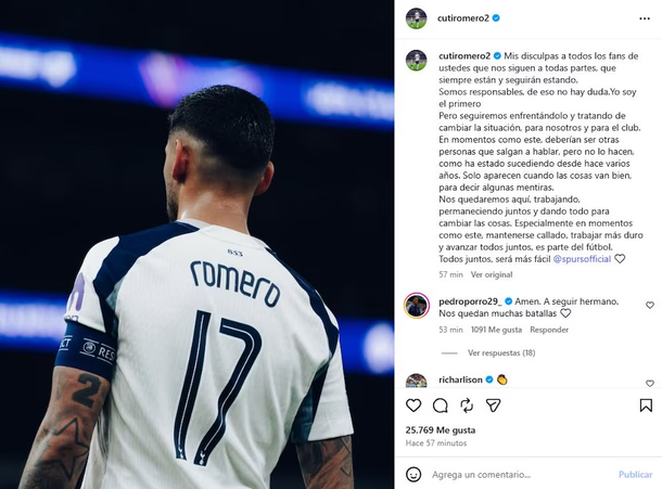 El mensaje subió de tono cuando el defensor apuntó directamente contra la dirigencia del Tottenham, a la que acusó de no dar la cara en los momentos adversos. “En momentos como este, deberían ser otras personas que salgan a hablar, pero no lo hacen, como ha estado sucediendo desde hace varios años. Solo aparecen cuando las cosas van bien, para decir algunas mentiras”, lanzó Romero, dejando al descubierto un malestar que parece venir de arrastre y que no se limita únicamente a la coyuntura actual.