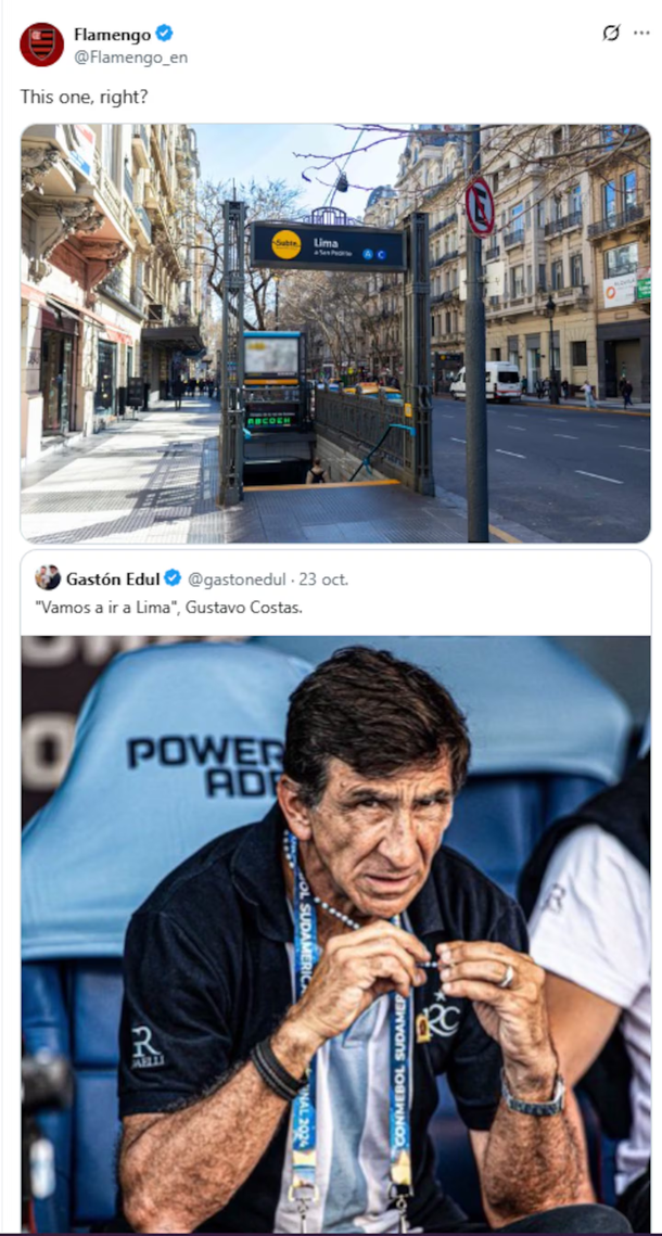 En sus redes, acompañó la frase del técnico con una imagen del “estadio Lima” de la línea C del subte de Buenos Aires y el texto: “¿Esta, verdad?”, ironizando sobre el destino final del conjunto argentino. La publicación, que combinó humor con provocación, se replicó miles de veces y fue celebrada por los hinchas brasileños y argentinos.