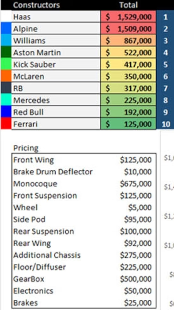 El ranking elaborado por el usuario de Reddit estima los daños de cada piloto según los costos promedio de partes clave del monoplaza, como el alerón delantero (125 mil dólares), el monocasco (675 mil), la caja de cambios (500 mil) o el piso del auto (225 mil), entre otros.