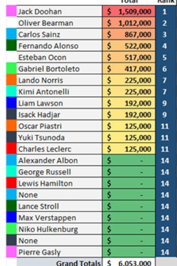 - Oliver Bearman (Haas): 1.012.000 dólares