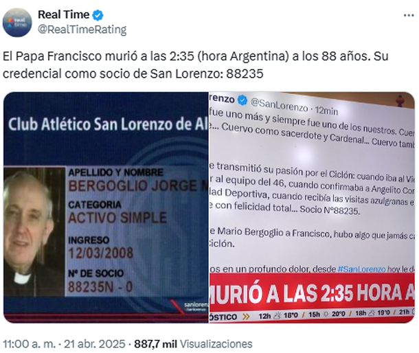 La llamativa coincidencia entre la hora de la muerte del papa Francisco y su número de socio en San Lorenzo